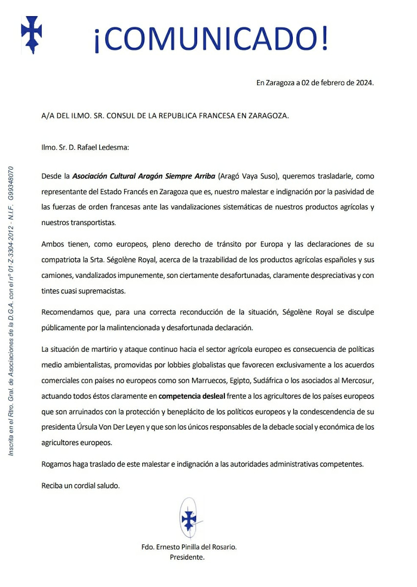 La Asociación Cultural Aragón Siempre Arriba ha presentado al Cónsul de la República Francesa en Zaragoza, ante el vandalismo desatado en su País contra los transportistas y productos españoles, este comunicado expresando el lógico malestar e indignación que estas situaciones producen.